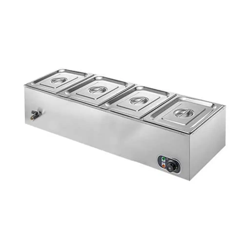 باين ماري تجاري، سخان طعام كهربائي بقوة 1500 واط، طاولة بخار من ستانليس ستيل للتحكم في درجة الحرارة مع أغطية، صنبور تصريف، حاويات GN 1/4 – 150 مم × 4
