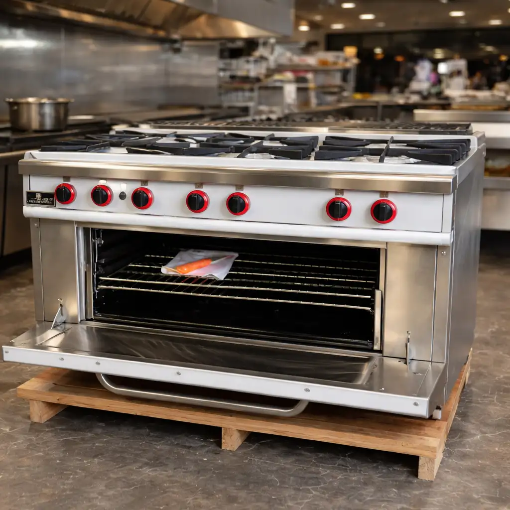 موقد غاز بـ6 شعلات مع فرن كامل بالأسفل هو الحل المثالي للمطابخ التجارية في المطاعم والفنادق وخدمات التموين. يتميز بـ 6 شعلات غاز عالية الكفاءة توفّر توزيعًا متساويًا وسريعًا للحرارة، مما يتيح لك طهي عدة أطباق في وقت واحد.