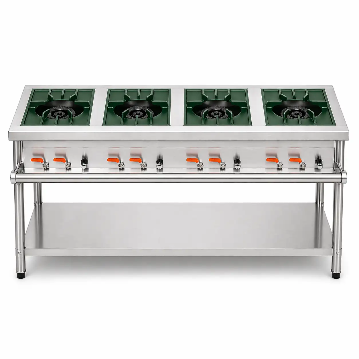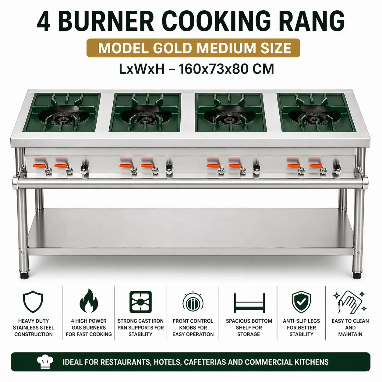 A robust and high-capacity 4 burner commercial cooking range designed for professional kitchens, restaurants, and catering operations. Manufactured with premium stainless steel, this unit ensures durability, hygiene, and long-term performance. The four burners are arranged in an alternating opposite direction layout for better workspace efficiency and heat distribution. With powerful burners, stable cast iron supports, and a spacious bottom shelf, this range is built to handle heavy-duty cooking with ease.