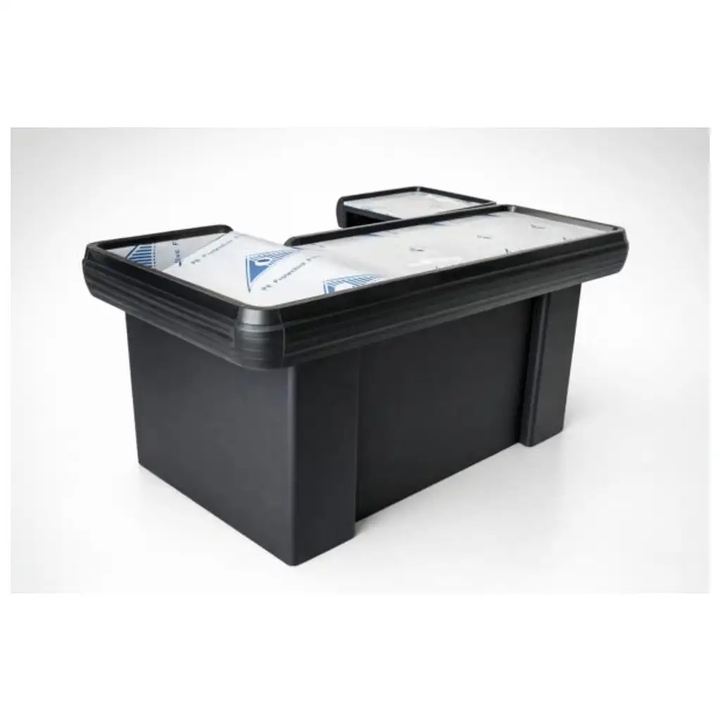 This durable checkout counter is designed for smooth retail operations. It features a right-side black guiding rail for easy item handling and a scratch-resistant granular steel top for heavy-duty use. Includes a built-in box for storage.