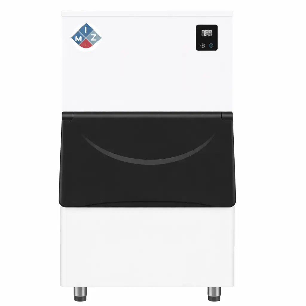 Featuring a modern white-and-black design with stainless steel legs and an intuitive digital control panel, the machine combines performance with ease of use. The insulated bin keeps ice fresh for extended periods, making it a reliable solution for heavy-duty operations.