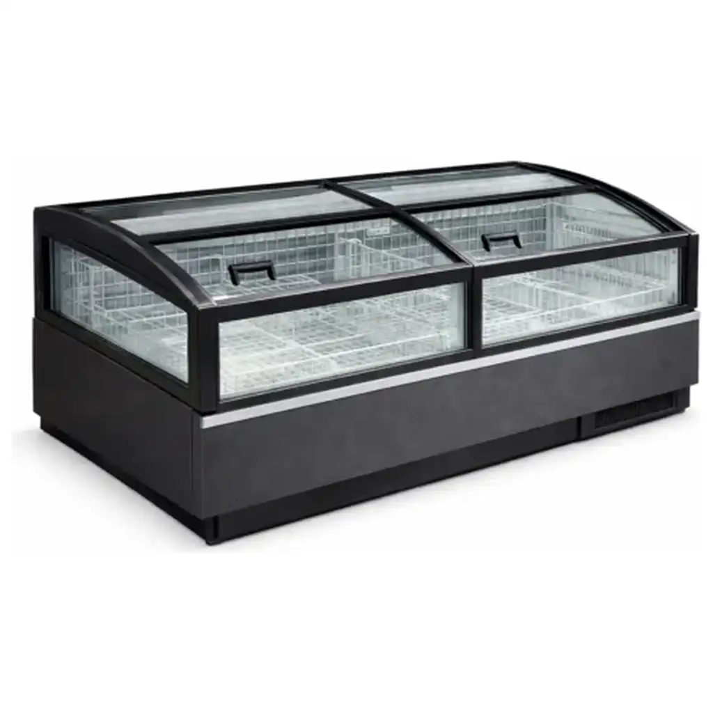 The ISLANDY PRO Island Freezer is a high-capacity commercial display freezer designed to enhance product visibility and increase impulse sales in retail environments. With its elegant black exterior and 4-side tempered glass design, this model provides full 360° visibility, making it ideal for supermarkets, hypermarkets, and large grocery stores.