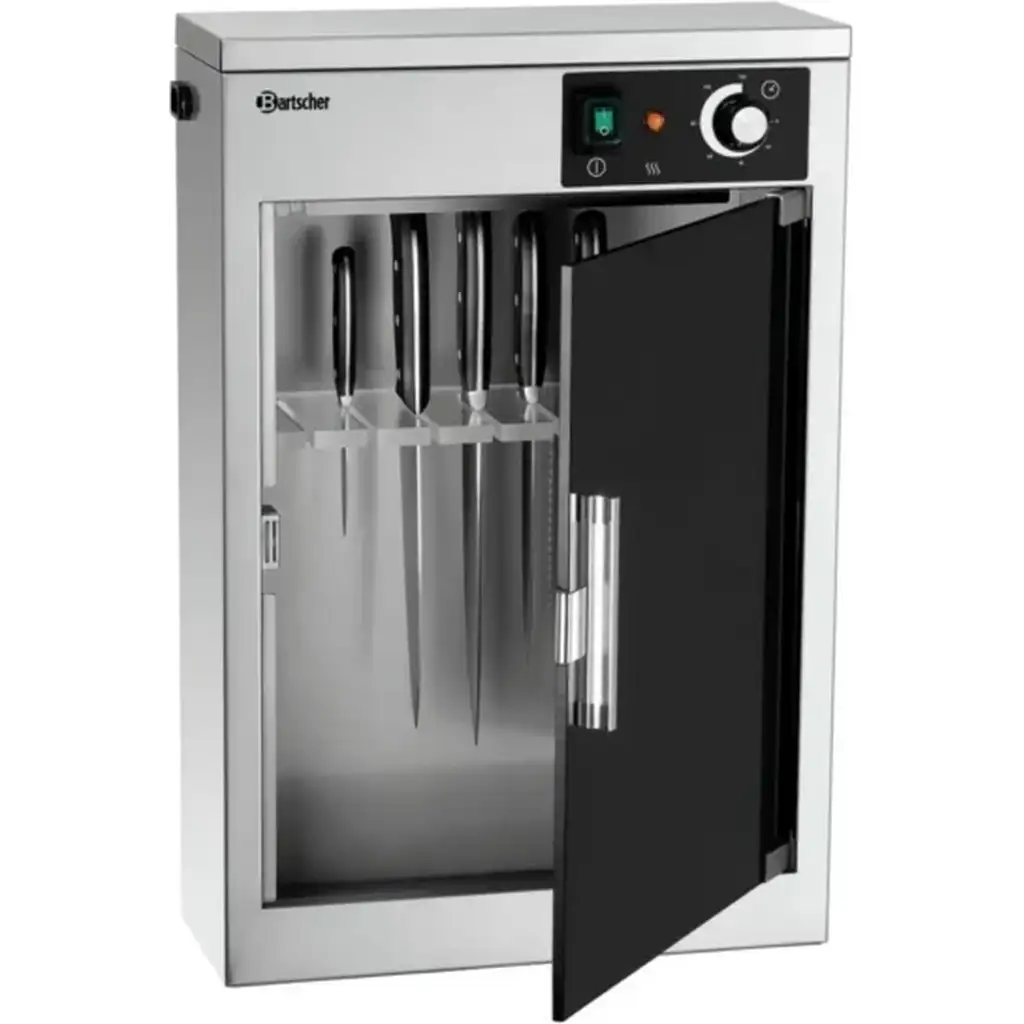 Its stainless steel construction with a clear plexiglass door allows visibility of the knives during the sterilization process.