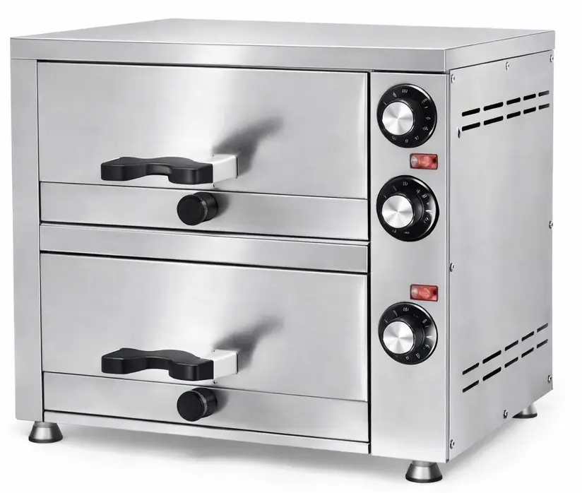 The 14-Inch Electric Pizza Oven Countertop Double is a high-efficiency commercial pizza oven designed for fast-paced kitchens. Featuring two independent decks with grill-type shelves, it allows simultaneous baking of multiple pizzas while maintaining consistent heat distribution. Its compact countertop design, combined with durable stainless steel construction, makes it ideal for restaurants, cafés, food trucks, and snack bars requiring higher output in limited space.