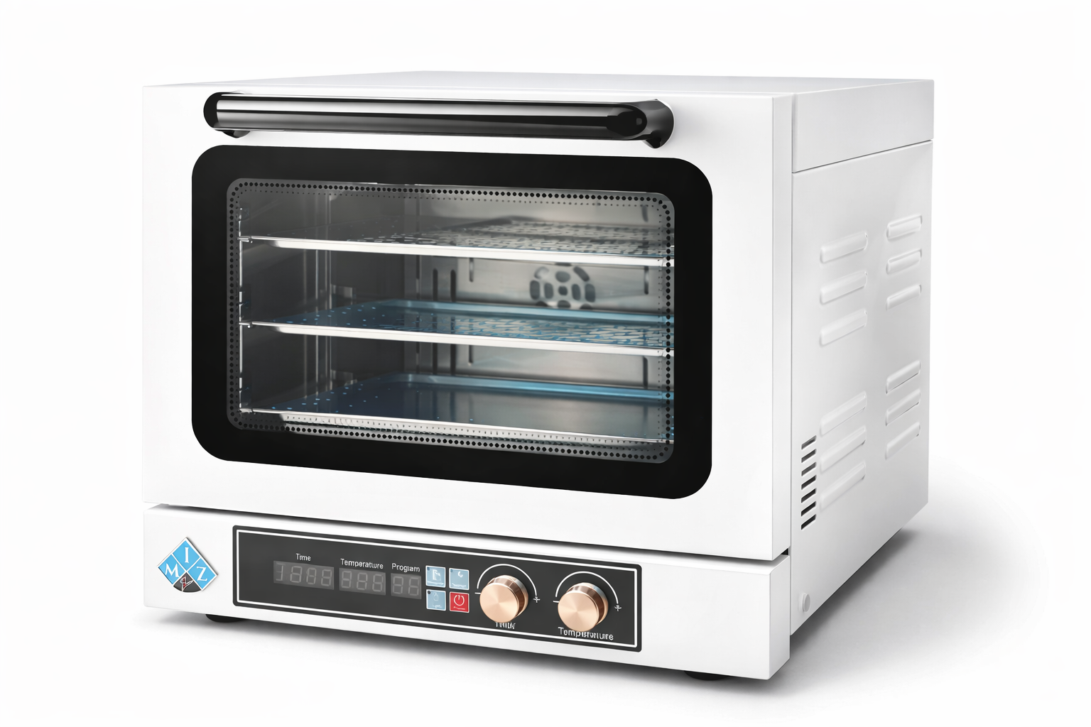 The MIZ Electric Convection Oven ECO4-35 is a compact, high-performance 3-tray commercial oven designed for professional kitchens, bakeries, cafés, and restaurants. It features a powerful convection system that distributes heat evenly, ensuring consistent baking and roasting results every time. Built with a durable stainless-steel body and a clear tempered glass door, this oven allows easy monitoring while maintaining excellent heat retention. Its digital control panel enables precise temperature and time adjustments, making it ideal for daily commercial use.